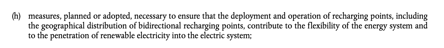 Let’s start with the requirement with the earliest deadline (30 June 2024) for Member States. It’s an assessment of how electric vehicles can contribute to the flexibility of the energy system and the further absorption of renewable electricity. See the text below.