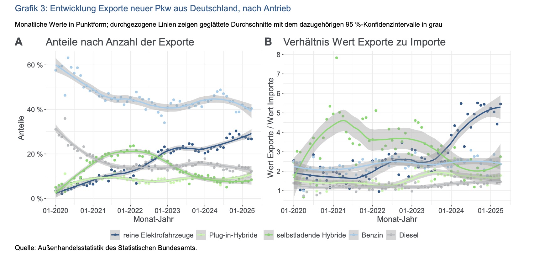 The German automotive industry’s best hope is electric cars. This is a fascinating graph from KfW Research (pdf: https://www.kfw.de/PDF/Download-Center/Konzernthemen/Research/PDF-Dokumente-Fokus-Volkswirtschaft/Fokus-2025/Fokus-Nr.-511-August-2025-Elektroautos.pdf) based on Statistisches Bundesamt (Destatis) data, shared by Jonas Schaible in his excellent newsletter.